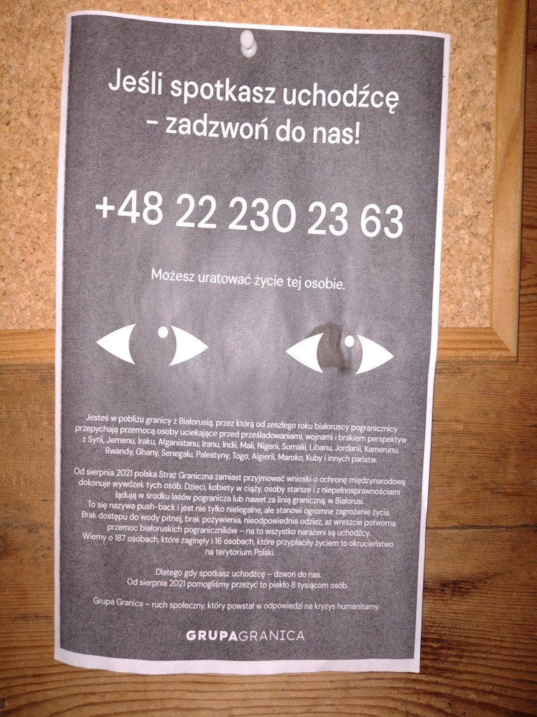 W Puszczy Białowieskiej wciąż są migrujący ludzie. Białowieża cała rozjechana rosomakami i ciężarówkami do „puszbaków” (wywożenia uchodźców ponownie na granicę białoruską). Pusta, choć zazwyczaj o tej porze roku sporo jeszcze było turystów przyrodniczych. W drodze z Hajnówki po zmroku samochody zatrzymywane są przez policyjne oddziały prewencji przewozu nielegalnych cudzoziemców (oddział ze Szczecina, wymamrał młody chłopak w polowym mudnurze). Przy słowiańskiej urodzie i pustym bagażniku można się jednak dosyć szybko przedostać dalej. Mur na granicy okładany jest właśnie koncertiną (dźwięczna muzycznie nazwa na banalny w swojej brutalności drut żyletkowy). W Teremiskach spokojnie, jakoś wręcz niepokojąco sielsko.