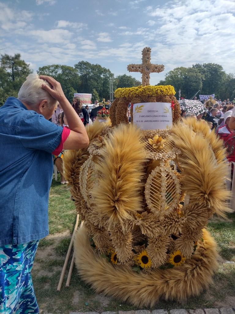 Czyli z grubsza te kwestie, które dekadę temu omawialiśmy na zjazdach kooperatyw spożywczych, tylko opisywane innym językiem. Wystąpienia oficjeli wydawały się dużo bardziej przemyślane i konkretne niż w minionym roku, miały też jednak (podobnie jak towarzyszące obrzędy religijne) podnosić na duchu i wzmacniać etos pracy. Całkiem nieźle trzymały się faktów, tym razem podstawową metodą edycji nie było przeinaczenie a pomijanie – w tym, co udało mi się usłyszeć (m.in. przemówienia prezydenta Andrzeja Dudy, marszałka Grzegorza Schreibera, odczytany list od prezesa Jarosława Kaczyńskiego) ani razu eksplicytnie nie padł temat stanu wyjątkowego przy polskiej granicy z Białorusią, temat Ukrainy podnoszony był za to wielokrotnie, rolnikom dziękowano za odegranie ważnej roli w przyjmowaniu uchodźców stamtąd.