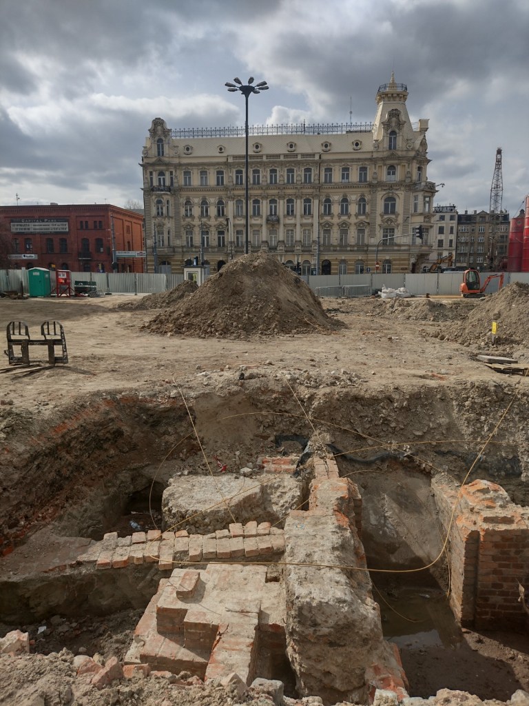 Today this crossroad is filled with fences and construction machines, building, rebuilding, changing. A cross-city railway tunnel is being drilled underground. That part of the city as I knew it, living in Łódź since 2006, doesn’t exist anymore. Huge poplar trees were cut down, and the little booth with tasty local bread called “żulik” (dark, with raisins) disappeared. Recently construction workers uncovered the foundations of the Great Synagogue that once anchored the street directly across from Pinkus House. The Great Synagogue was destroyed by the Nazis in 1939, as were all synagogues in Łódź.